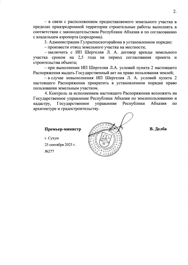 РАСПОРЯЖЕНИЕ Кабинета Министров Республики Абхазия от 25.09.2025 №277 "О даче согласия Администрации Гулрыпшского района на предоставление индивидуальному предпринимателю Шергелия В. А. в постоянное пользование 0,06 га земли в с. Дранда для строительства средства размещения гостиничного типа"