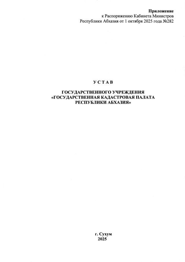 РАСПОРЯЖЕНИЕ Кабинета Министров Республики Абхазия от 01.10.2025 №282 "Об утверждении Устава государственного учреждения <Государственная кадастровая палата Республики Абхазия>"