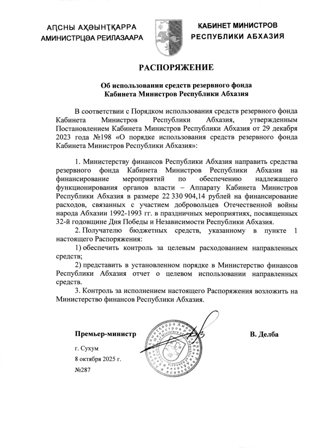 РАСПОРЯЖЕНИЕ Кабинета Министров Республики Абхазия от 08.10.2025 №287 "Об использовании средств резервного фонда Кабинета Министров Республики Абхазия"