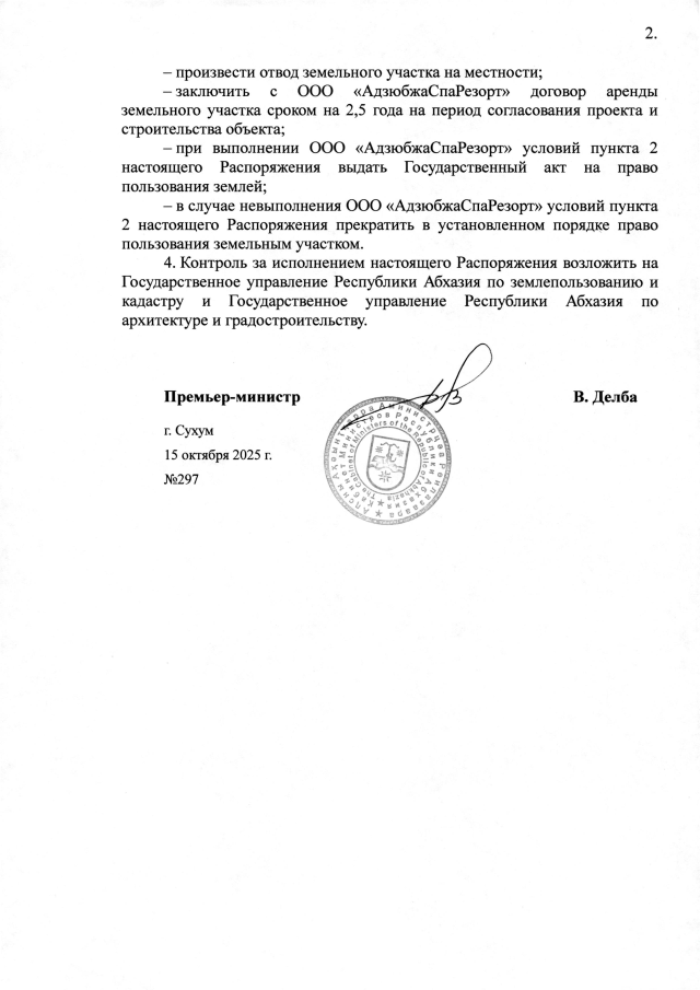 РАСПОРЯЖЕНИЕ Кабинета Министров Республики Абхазия от 15.10.2025 №297 "О даче согласия Администрации Очамчырского района на предоставление в постоянное пользование обществу с ограниченной ответственностью <АдзюбжаСпаРезорт> земельного участка площадью 5,0 га в селе Адзюбжа для строительства средства размещения санаторно-курортного типа"