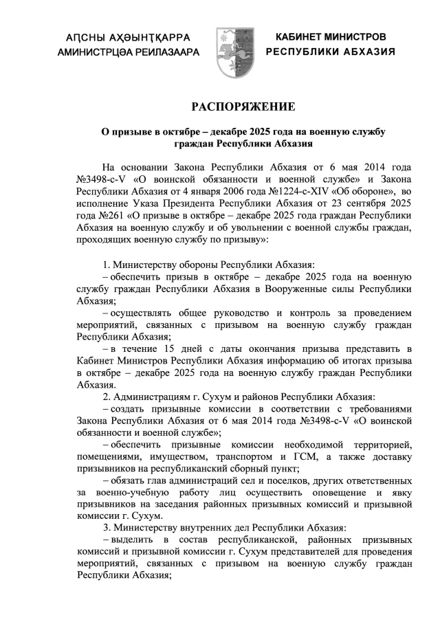 РАСПОРЯЖЕНИЕ Кабинета Министров Республики Абхазия от 16.10.2025 №300 "О призыве в октябре - декабре 2025 года на военную службу граждан Республики Абхазия"