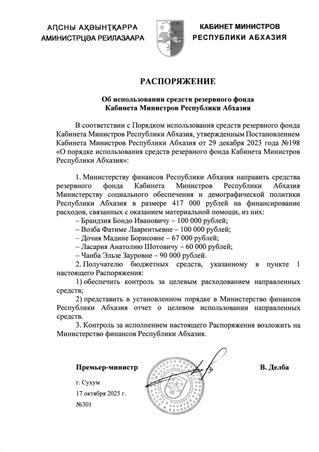 РАСПОРЯЖЕНИЕ Кабинета Министров Республики Абхазия от 17.10.2025 №301 "Об использовании средств резервного фонда Кабинета Министров Республики Абхазия"