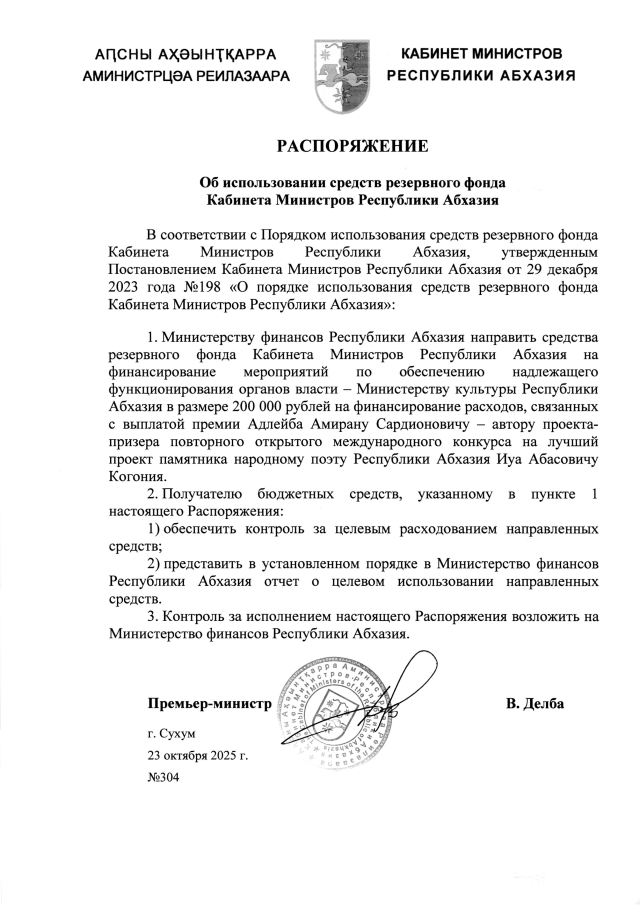 РАСПОРЯЖЕНИЕ Кабинета Министров Республики Абхазия от 23.10.2025 №304 "Об использовании средств резервного фонда Кабинета Министров Республики Абхазия"