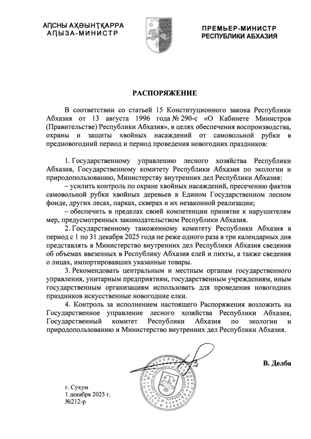 РАСПОРЯЖЕНИЕ Кабинета Министров Республики Абхазия от 01.12.2025 №212-р "О защите хвойных насаждений от самовольной рубки в предновогодний период"