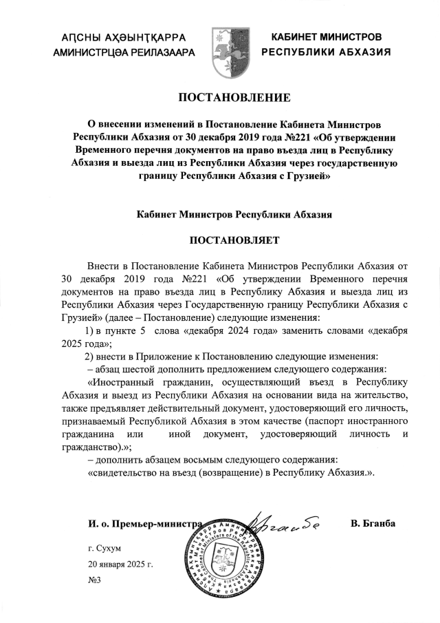 Постановление Кабинета Министров Республики Абхазия от 20.01.2025 №3 "О внесении изменений в Постановление Кабинета Министров Республики Абхазия от 30 декабря 2019 года №221 <Об утверждении Временного перечня документов на право въезда лиц в Республику Абхазия и выезда лиц из Республики Абхазия через государственную границу Республики Абхазия с Грузией>"