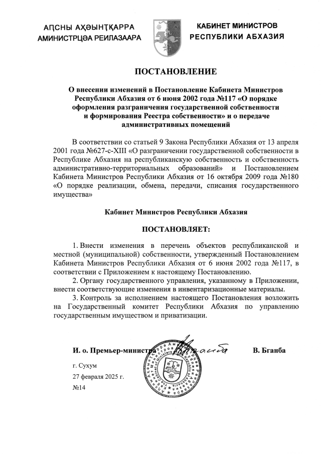 Постановление Кабинета Министров Республики Абхазия от 27.02.2025 №13 "О внесении изменений в Постановление Кабинета Министров Республики Абхазия от 6 июня 2002 года №117 <О порядке оформления разграничения государственной собственности и формирования Реестра собственности> и о передаче административных помещений"