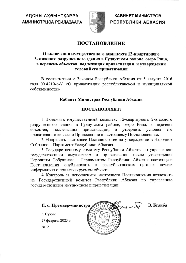 Постановление Кабинета Министров Республики Абхазия от 27.02.2025 №12 "О включении имущественного комплекса 12-квартирного 2-этажного разрушенного здания в Гудаутском районе, озеро Рица, в перечень объектов, подлежащих приватизации, и утверждении условий его приватизации"