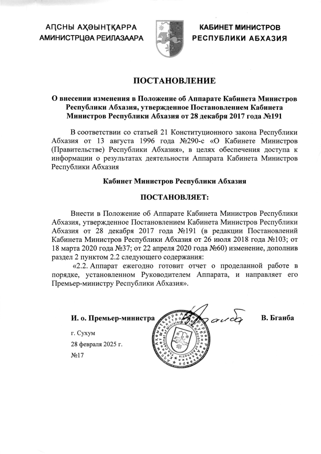 Постановление Кабинета Министров Республики Абхазия от 28.02.2025 №17 "О внесении изменения в Положение об Аппарате Кабинета Министров Республики Абхазия, утвержденное Постановлением Кабинета Министров Республики Абхазия от 28 декабря 2017 года №191"