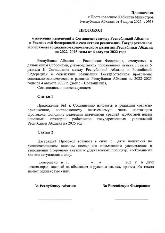 Постановление Кабинета Министров Республики Абхазия от 04.03.2025 №18 "О представлении Президенту Республики Абхазия предложения о заключении Протокола о внесении изменений в Соглашение между Республикой Абхазия и Российской Федерацией о содействии реализации Государственной программы социально-экономического развития Республики Абхазия на 2022-2025 годы от 4 августа 2022 года"
