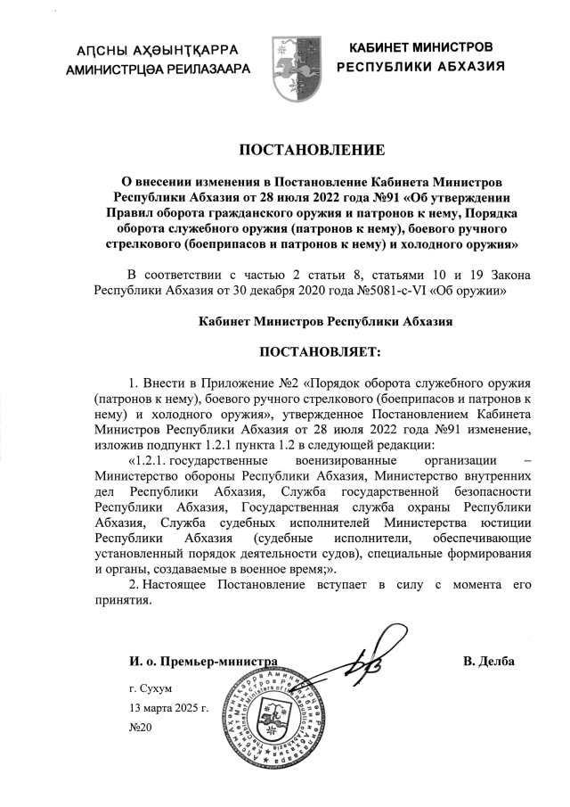 Постановление Кабинета Министров Республики Абхазия от 13.03.2025 №20 "О внесении изменения в Постановление Кабинета Министров Республики Абхазия от 28 июля 2022 года №91 <Об утверждении Правил оборота гражданского оружия и патронов к нему, Порядка оборота служебного оружия (патронов к нему), боевого ручного стрелкового (боеприпасов и патронов к нему) и холодного оружия>"