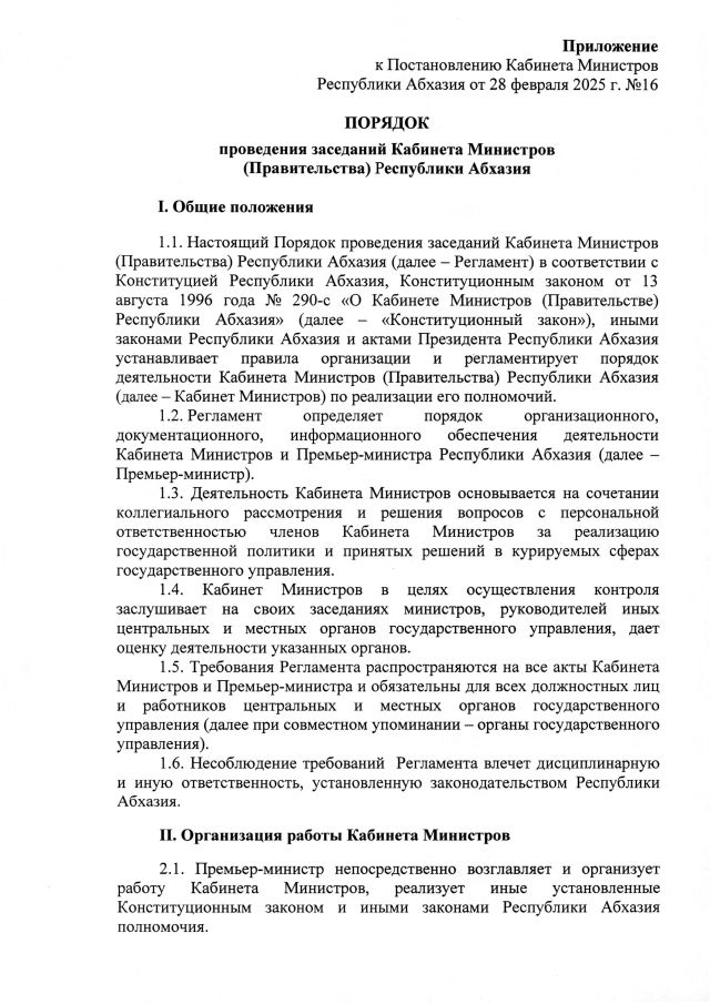 Постановление Кабинета Министров Республики Абхазия от 28.02.2025 №16 "Об утверждении Порядка проведения заседаний Кабинета Министров (Правительства) Республики Абхазия"