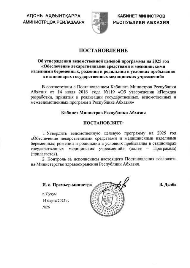 Постановление Кабинета Министров Республики Абхазия от 14.03.2025 №26 "Об утверждении ведомственной целевой программы на 2025 год <Обеспечение лекарственными средствами и медицинскими изделиями беременных, рожениц и родильниц в условиях пребывания в стационарах государственных медицинских учреждений>"