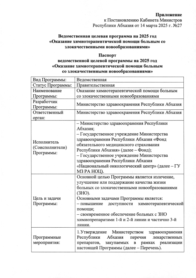 Постановление Кабинета Министров Республики Абхазия от 14.03.2025 №27 "Об утверждении ведомственной целевой программы на 2025 год <Оказание химиотерапевтической помощи больным со злокачественными новообразованиями>"
