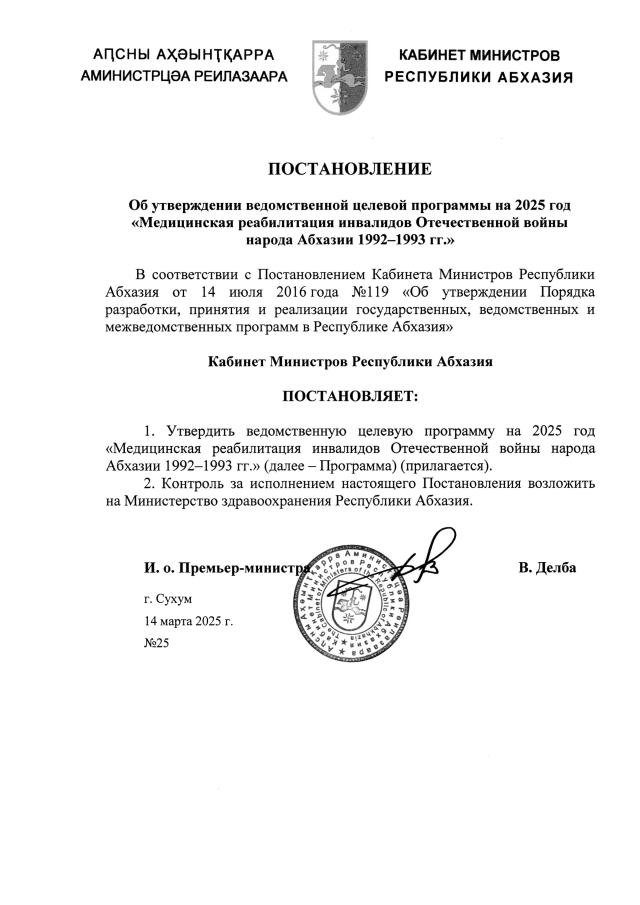 Постановление Кабинета Министров Республики Абхазия от 14.03.2025 №25 "Об утверждении ведомственной целевой программы на 2025 год <Медицинская реабилитация инвалидов Отечественной войны народа Абхазии 1992-1993 гг.>"