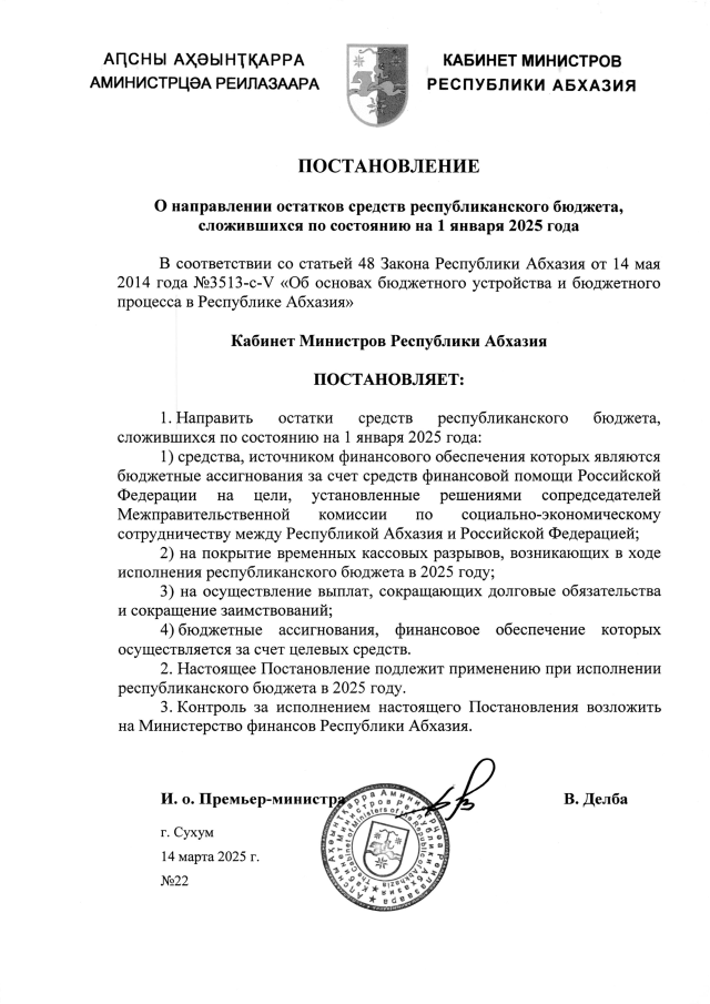 Постановление Кабинета Министров Республики Абхазия от 14.03.2025 №22 "О направлении остатков средств республиканского бюджета, сложившихся по состоянию на 1 января 2025 года"