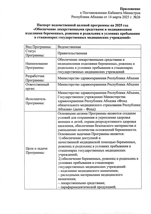 Постановление Кабинета Министров Республики Абхазия от 14.03.2025 №26 "Об утверждении ведомственной целевой программы на 2025 год <Обеспечение лекарственными средствами и медицинскими изделиями беременных, рожениц и родильниц в условиях пребывания в стационарах государственных медицинских учреждений>"
