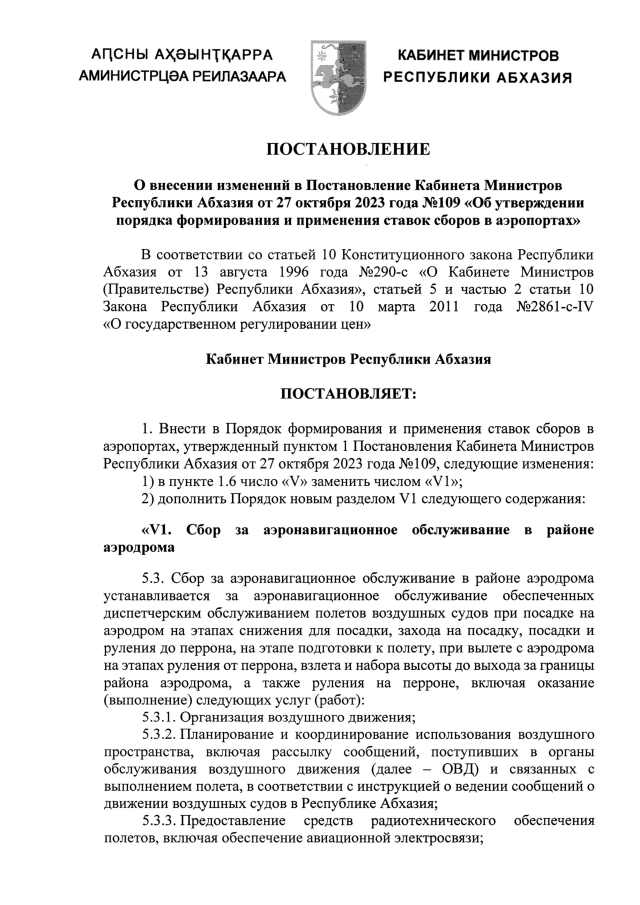 Постановление Кабинета Министров Республики Абхазия от 14.03.2025 №28 "О внесении изменений в Постановление Кабинета Министров Республики Абхазия от 27 октября 2023 года №109 <Об утверждении порядка формирования и применения ставок сборов в аэропортах>"