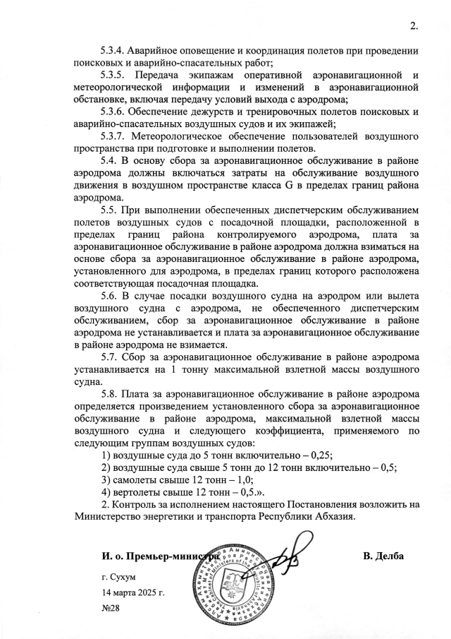 Постановление Кабинета Министров Республики Абхазия от 14.03.2025 №28 "О внесении изменений в Постановление Кабинета Министров Республики Абхазия от 27 октября 2023 года №109 <Об утверждении порядка формирования и применения ставок сборов в аэропортах>"