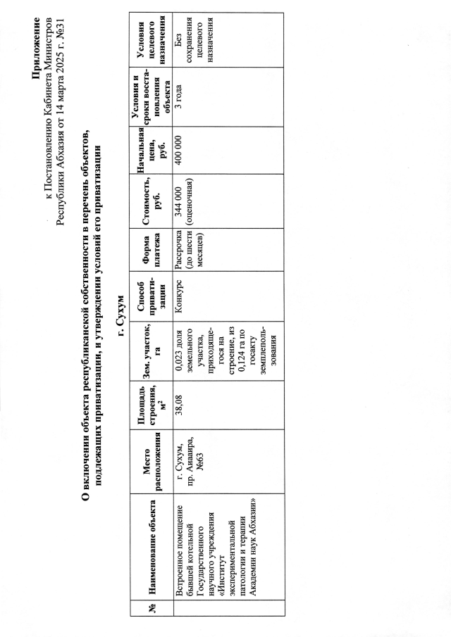 Постановление Кабинета Министров Республики Абхазия от 14.03.2025 №31 "О включении встроенного помещения бывшей котельной Государственного научного учреждения <Институт экспериментальной патологии и терапии Академии наук Абхазии> в перечень объектов, подлежащих приватизации, и утверждении условий его приватизации"