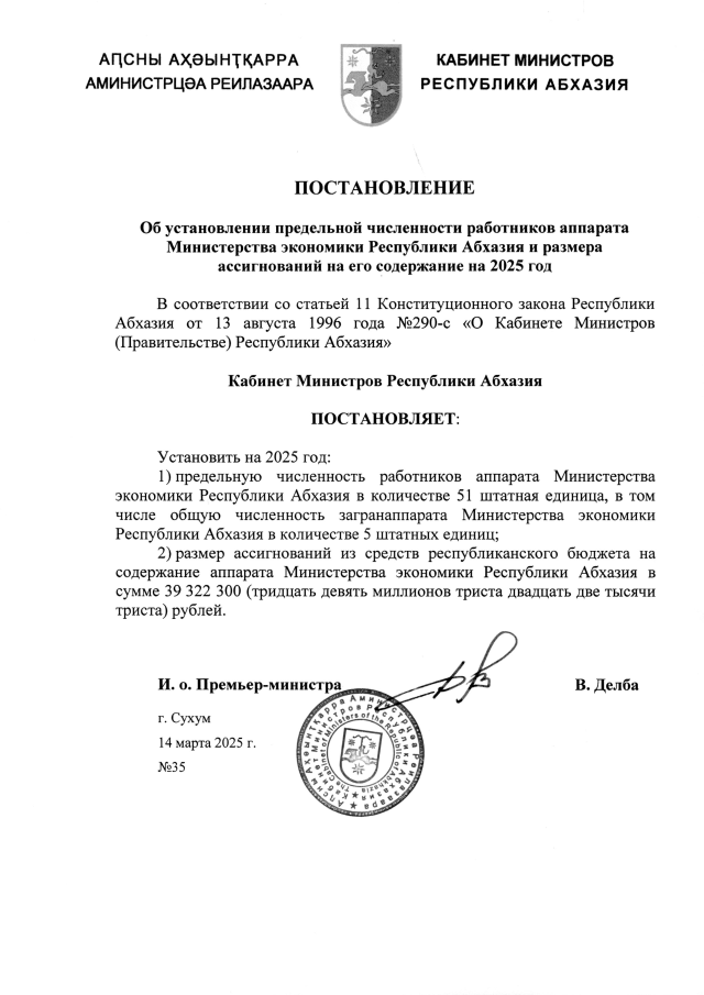 Постановление Кабинета Министров Республики Абхазия от 14.03.2025 №35 "Об установлении предельной численности работников аппарата Министерства экономики Республики Абхазия и размера ассигнований на его содержание на 2025 год "