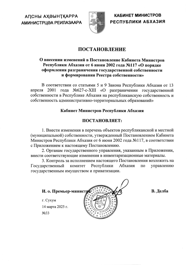 Постановление Кабинета Министров Республики Абхазия от 14.03.2025 №33 "О внесении изменений в Постановление Кабинета Министров Республики Абхазия от 6 июня 2002 года №117 <О порядке оформления разграничения государственной собственности и формирования Реестра собственности>"