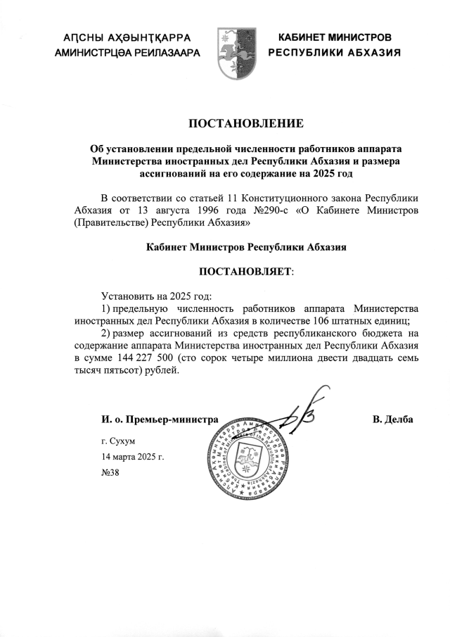 Постановление Кабинета Министров Республики Абхазия от 14.03.2025 №38 "Об установлении предельной численности работников аппарата Министерства иностранных дел Республики Абхазия и размера ассигнований на его содержание на 2025 год"