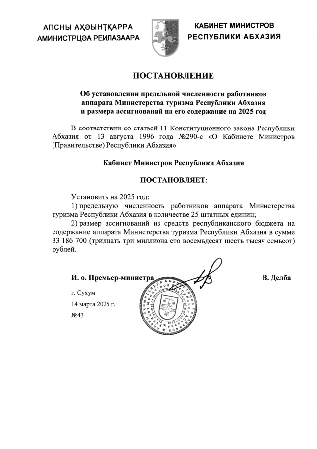 Постановление Кабинета Министров Республики Абхазия от 14.03.2025 №43 "Об установлении предельной численности работников аппарата Министерства туризма Республики Абхазия и размера ассигнований на его содержание на 2025 год"