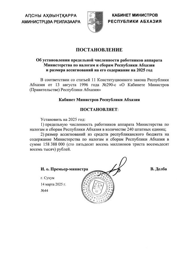 Постановление Кабинета Министров Республики Абхазия от 14.03.2025 №44 "Об установлении предельной численности работников аппарата Министерства по налогам и сборам Республики Абхазия и размера ассигнований на его содержание на 2025 год"