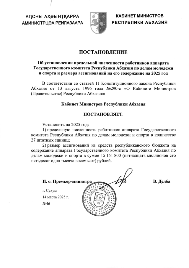Постановление Кабинета Министров Республики Абхазия от 14.03.2025 №46 "Об установлении предельной численности работников аппарата Государственного комитета Республики Абхазия по делам молодежи и спорта и размера ассигнований на его содержание на 2025 год"