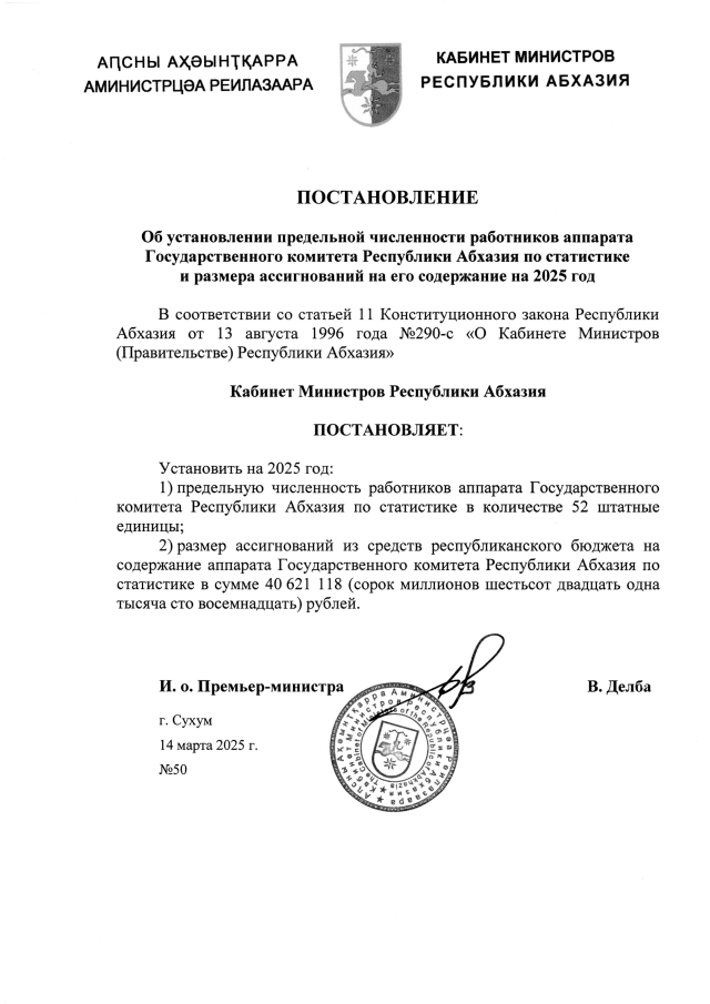 Постановление Кабинета Министров Республики Абхазия от 14.03.2025 №50 "Об установлении предельной численности работников аппарата Государственного комитета Республики Абхазия по статистике и размера ассигнований на его содержание на 2025 год"