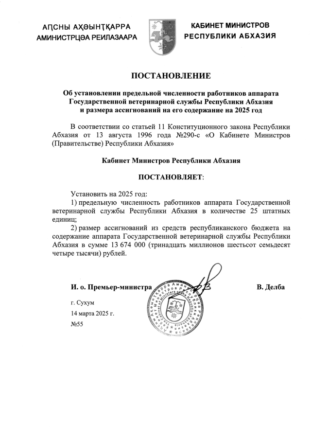 Постановление Кабинета Министров Республики Абхазия от 14.03.2025 №55 "Об установлении предельной численности работников аппарата Государственной ветеринарной службы Республики Абхазия и размера ассигнований на его содержание на 2025 год"