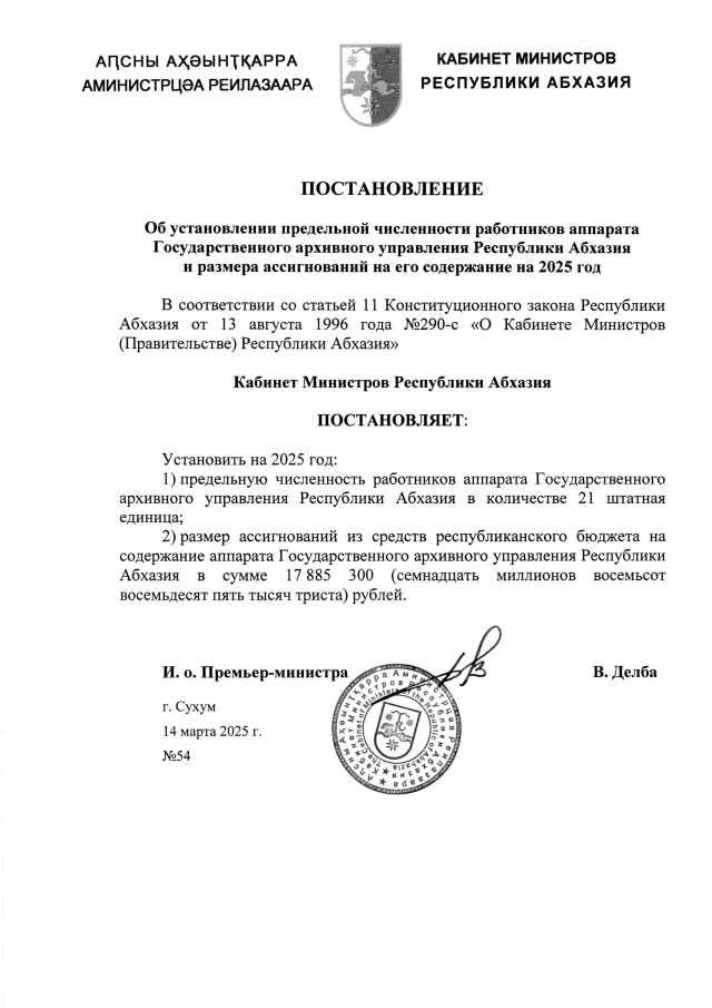 Постановление Кабинета Министров Республики Абхазия от 14.03.2025 №54 "Об установлении предельной численности работников аппарата Государственного архивного управления Республики Абхазия и размера ассигнований на его содержание на 2025 год"