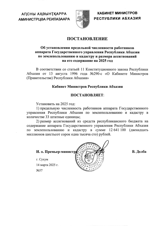 Постановление Кабинета Министров Республики Абхазия от 14.03.2025 №57 "Об установлении предельной численности работников аппарата Государственного управления Республики Абхазия по землепользованию и кадастру и размера ассигнований на его содержание на 2025 год"