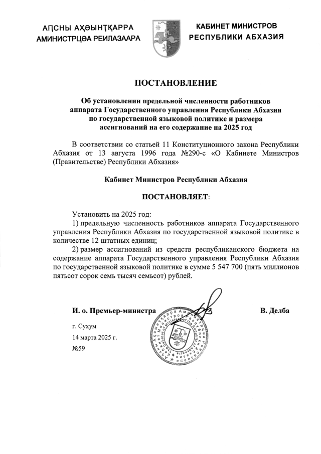 Постановление Кабинета Министров Республики Абхазия от 14.03.2025 №59 "Об установлении предельной численности работников аппарата Государственного управления Республики Абхазия по государственной языковой политике и размера ассигнований на его содержание на 2025 год"