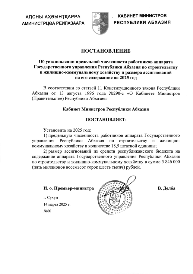 Постановление Кабинета Министров Республики Абхазия от 14.03.2025 №60 "Об установлении предельной численности работников аппарата Государственного управления Республики Абхазия по строительству и жилищно-коммунальному хозяйству и размера ассигнований на его содержание на 2025 год"