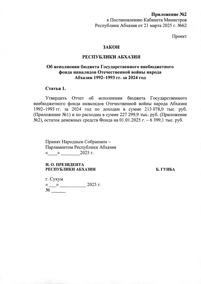 Постановление Кабинета Министров Республики Абхазия от 21.03.2025 №62 "Об исполнении бюджета Государственного внебюджетного фонда инвалидов Отечественной войны народа Абхазии 1992-1993 гг. за 2024 год"