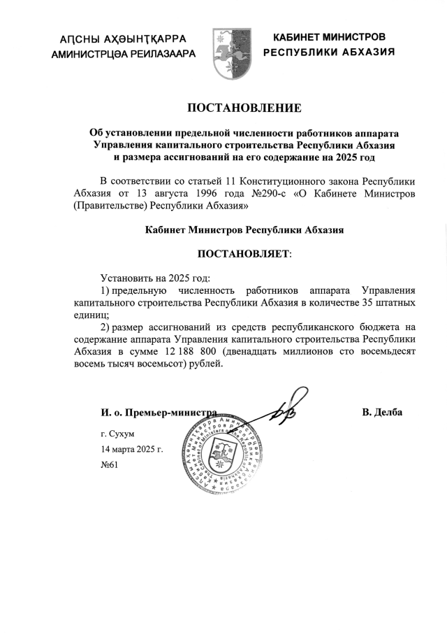 Постановление Кабинета Министров Республики Абхазия от 14.03.2025 №61 "Об установлении предельной численности работников аппарата Управления капитального строительства Республики Абхазия и размера ассигнований на его содержание на 2025 год"
