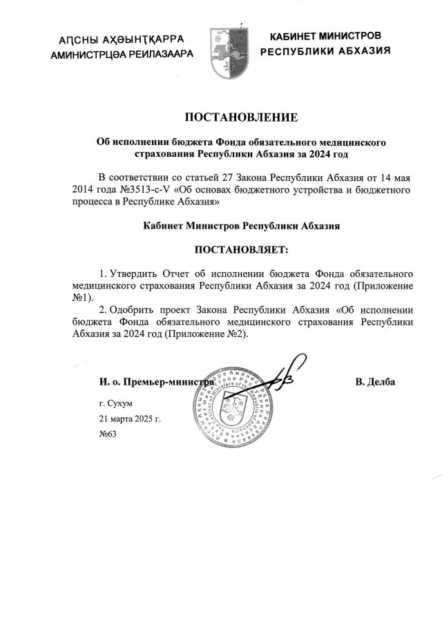 Постановление Кабинета Министров Республики Абхазия от 21.03.2025 №63 "Об исполнении бюджета Фонда обязательного медицинского страхования Республики Абхазия за 2024 год"