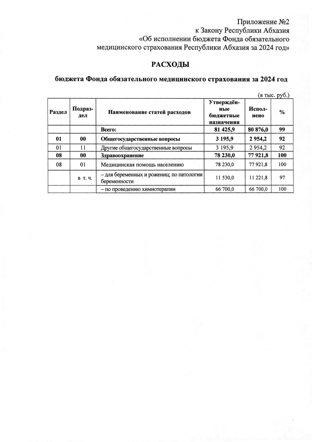 Постановление Кабинета Министров Республики Абхазия от 21.03.2025 №63 "Об исполнении бюджета Фонда обязательного медицинского страхования Республики Абхазия за 2024 год"