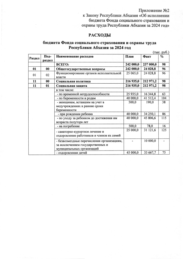 Постановление Кабинета Министров Республики Абхазия от 21.03.2025 №64 "Об исполнении бюджета Фонда социального страхования и охраны труда Республики Абхазия за 2024 год"