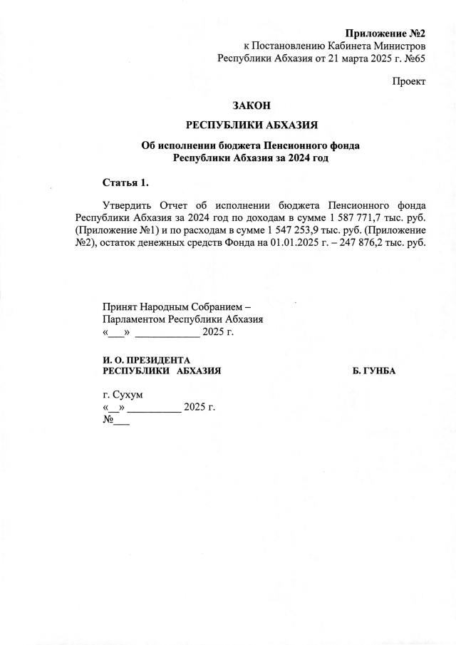 Постановление Кабинета Министров Республики Абхазия от 21.03.2025 №65 "Об исполнении бюджета Пенсионного фонда Республики Абхазия за 2024 год"