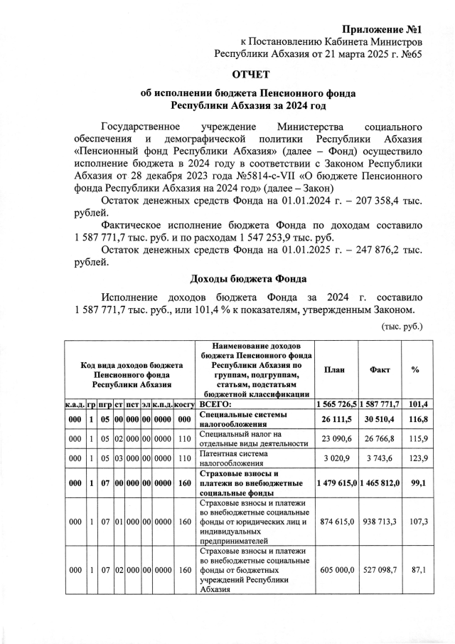 Постановление Кабинета Министров Республики Абхазия от 21.03.2025 №65 "Об исполнении бюджета Пенсионного фонда Республики Абхазия за 2024 год"