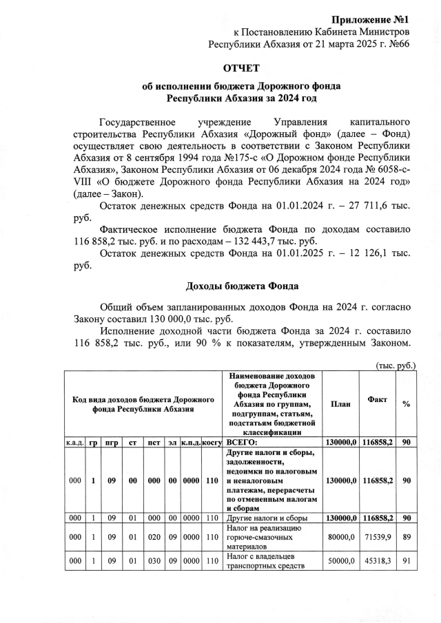 Постановление Кабинета Министров Республики Абхазия от 21.03.2025 №66 "Об исполнении бюджета Дорожного фонда Республики Абхазия за 2024 год"
