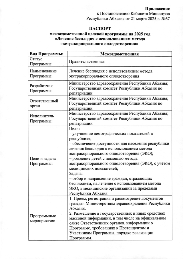 Постановление Кабинета Министров Республики Абхазия от 21.03.2025 №67 "Об утверждении межведомственной целевой программы на 2025 год <Лечение бесплодия с использованием метода экстракорпорального оплодотворения>"