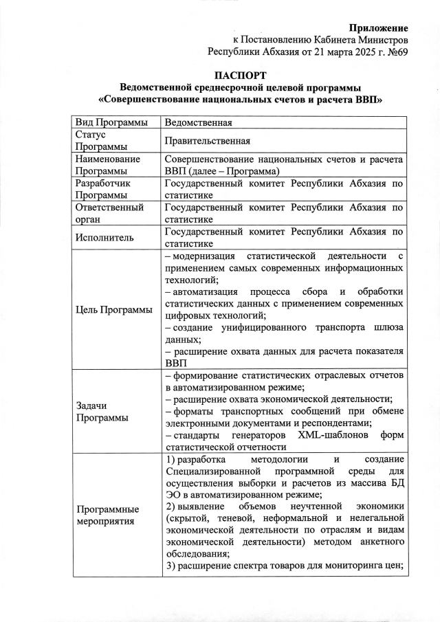 Постановление Кабинета Министров Республики Абхазия от 21.03.2025 №69 "Об утверждении ведомственной среднесрочной целевой программы <Совершенствование национальных счетов и расчета ВВП>"