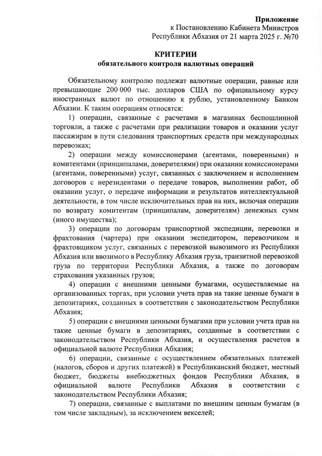 Постановление Кабинета Министров Республики Абхазия от 21.03.2025 №70 "Об утверждении критериев обязательного контроля валютных операций"