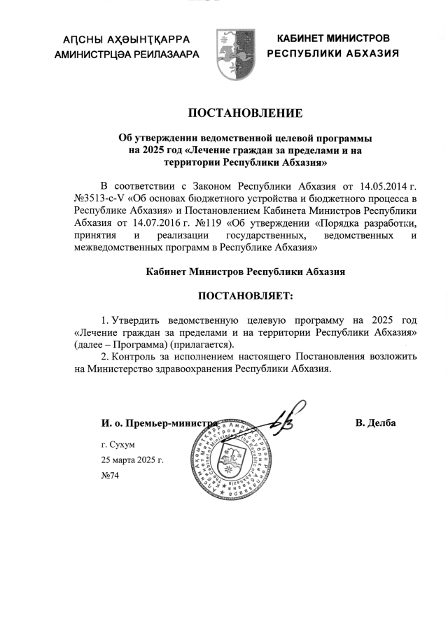 Постановление Кабинета Министров Республики Абхазия от 25.03.2025 №74 "Об утверждении ведомственной целевой программы на 2025 год <Лечение граждан за пределами и на территории Республики Абхазия>"
