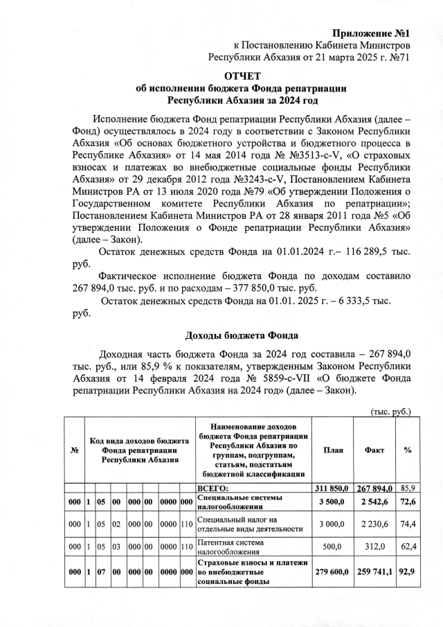 Постановление Кабинета Министров Республики Абхазия от 21.03.2025 №71 "О проекте Закона Республики Абхазия <Об исполнении бюджета Фонда репатриации Республики Абхазия за 2024 год>>"