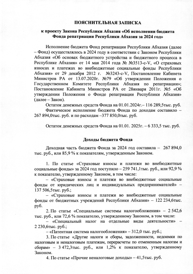 Постановление Кабинета Министров Республики Абхазия от 21.03.2025 №71 "О проекте Закона Республики Абхазия <Об исполнении бюджета Фонда репатриации Республики Абхазия за 2024 год>>"