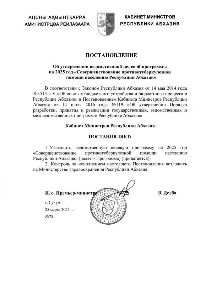 Постановление Кабинета Министров Республики Абхазия от 25.03.2025 №75 "Об утверждении ведомственной целевой программы на 2025 год <Совершенствование противотуберкулезной помощи населению Республики Абхазия>"